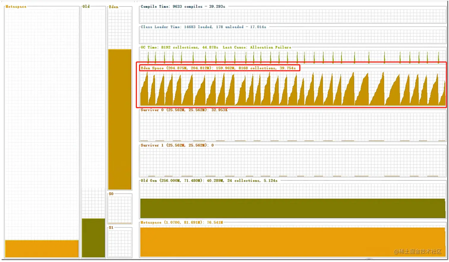 截图中,可以看到新生代中的Eden区频繁发生Minor GC,原因之一是分配的空间过小,目前是204.875M,导致当前占用空间经常超过204.875M,进而发生GC。若要分析是哪些代码频繁创建对象,还得进一步通过dump等方式进行分析,这里暂时不展开。
