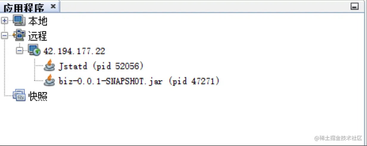[root@VM-16-4-centos bin]# jstatd -J-Djava.security.policy=jstatd.all.policy -J-Djava.rmi.server.hostname=42.194.xxx.xx & [1] 52056这时,观察visualvm工具右边栏菜单,可以看到远程连接的服务端已经自动连接上jstatd,这就意味着,可以在本地通过远程jstatd来监控开发服务器上的jvm信息了,从而进行jvm调优监控等操作。