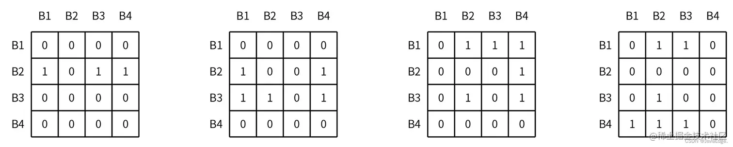 假设现在一个四路相连的缓存组包含数据块 B1、B2、B3、B4, 数据块的访问顺序为 B2、B3、B1、B4,则LRU矩阵在每次访问后的变化: