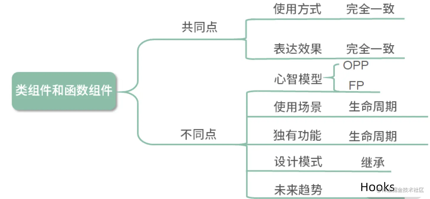 - 它们在开发时的心智模型上却存在巨大的差异。类组件是基于面向对象编程的,它主打的是继承、生命周期等核心概念;而函数组件内核是函数式编程,主打的是 immutable、没有副作用、引用透明等特点。
