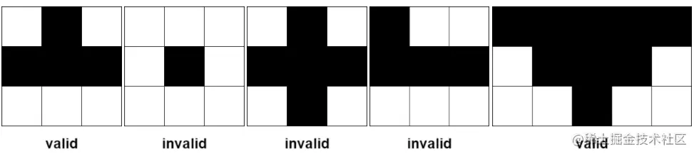 - 倒金字塔的顶点是倒金字塔最底部的单元格。倒金字塔的高度是它覆盖的行数。令 (r, c) 为金字塔的顶点,其高度为 h。然后,该图由单元格 (i, j) 组成,其中 r - h + 1 <= i <= r 和 c - (r - i) <= j <= c + (r - i)。图中显示了一些有效和无效金字塔(和倒金字塔)图的示例。黑色格子表示肥沃的格子。