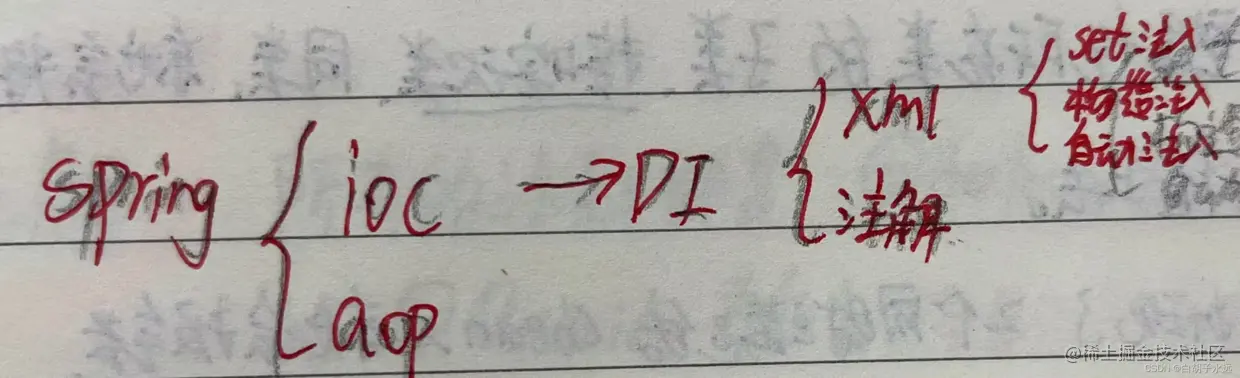 Spring的核心技术IOC(Intorol of Converse控制反转)的实现途径是DI(dependency Insert依赖注入)。而依赖注入(DI)的实现方式又有两种,xml方式和注解方式。如下图所示: