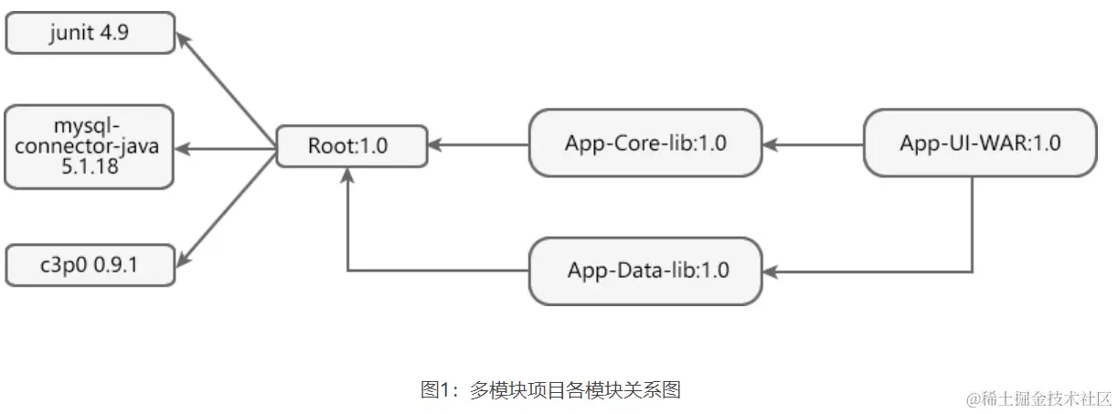 App-UI-WAR依赖于App-Core-lib和App-Data-lib。Root是App-Core-lib和App-Data-lib的父模块。Root在它的依赖部分定义了junit 4.9、mysql-connector-java 5.1.18以及c3p0 0.9.1作为其依赖。