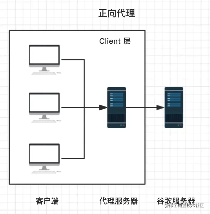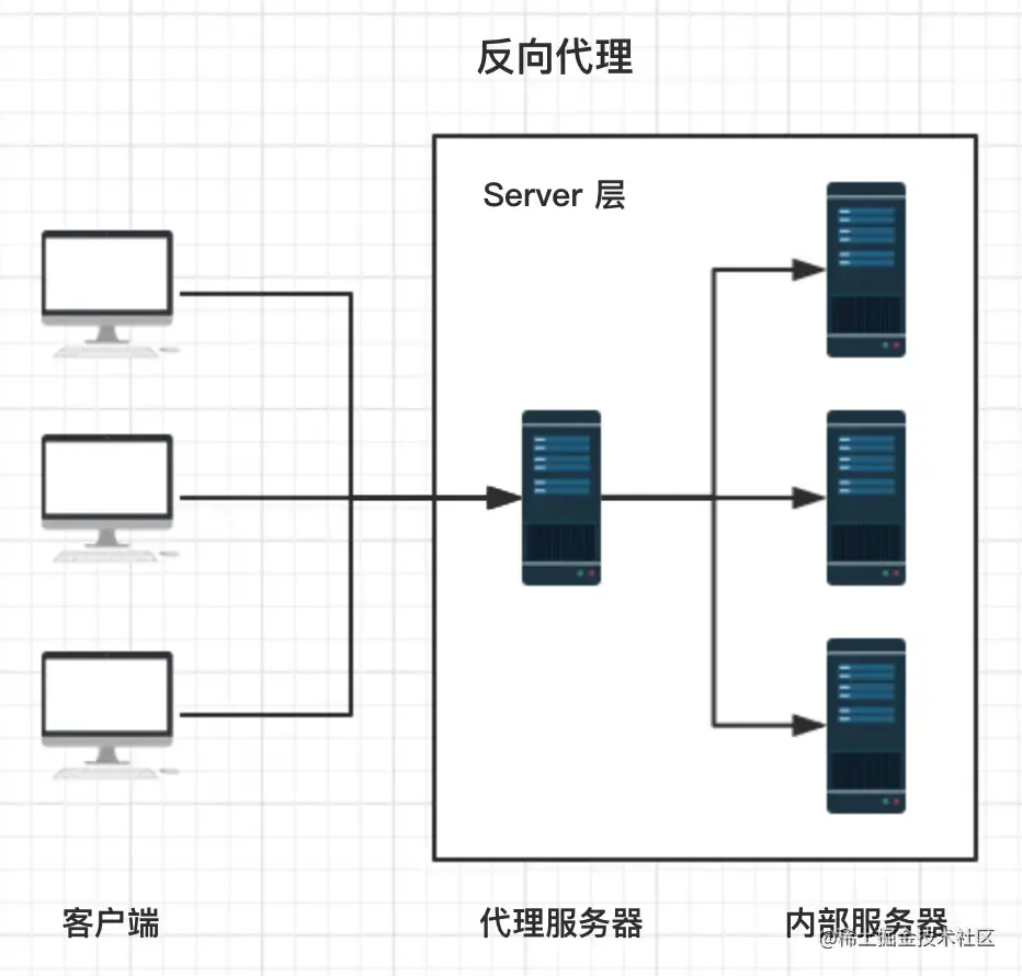 - 代理服务器属于 服务端层,因此称为反向代理。通常代理服务器与内部内容服务器会隶属于同一内网或者集群;