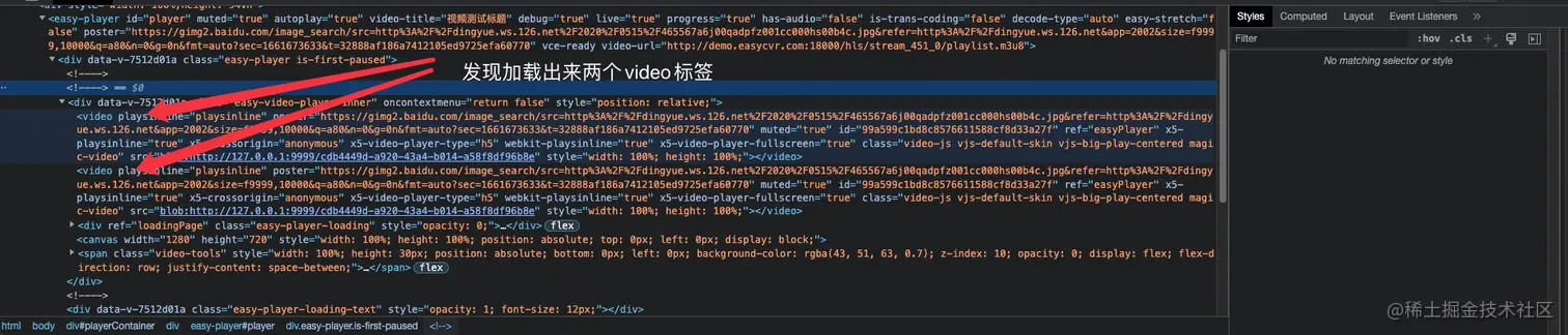 经过复现问题,发现播放器加载出现了两个video标签,猜测是初始化H.265时,播放器的video标签并没有成功销毁。