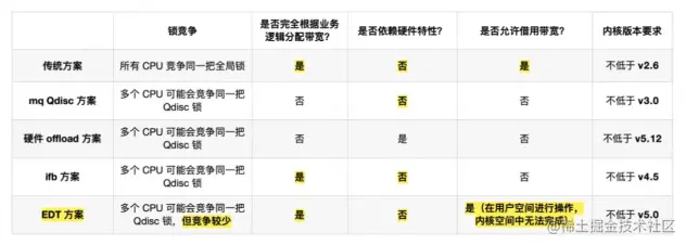 Linux操作系统中的流量控制器TC(Traffic Control)用于Linux内核的流量控制,主要是通过在输出端口处建立一个队列来实现流量控制。不过这些方案有一个共同的缺点,即依赖一把设备全局的 Qdisc spinlock 来进行同步。所以现在考虑在已有的基础上进行硬件的卸载。下图是我引用的一张字节跳动做的总结图,总结了现有的一些流控方案。