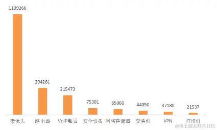 ,变化资产分别占 60% 和 40% [^1]。为保证资产的时效性与准确性,我们选择 2020 年 11 月的单轮国内物联网测绘结果,共发现 186 万个存活的 IP地址,具体国内物联网资产类型分布情况物联网设备类型分布如 下图 所示。其中,摄像头、 路由器、 VoIP电话数量分别位列前三,这和往年的分布是一样的,但是新增了安全设备和网络存储器; 网络安全设备主要是指防火墙、 WAF等安全产品;网络存储器( NAS)是一种专用数据存储服务器, 将存储设备与服务器彻底分离,集中管理数据,从而释放带宽,降低成本。近年来,国内的 NAS服务 器遭勒索病毒攻击事件频发,暴露互联网上的存储设备,更应该保障其安全。