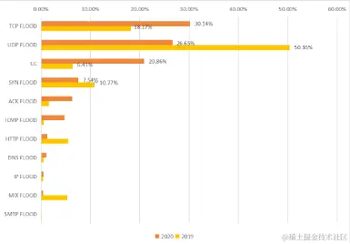 DDoS 类型方面,相比于 2019 年,TCP flood、UDP flood 和 CC 占据主导地位,其中 TCP flood 与 CC 比重明显上升,如下图所示: