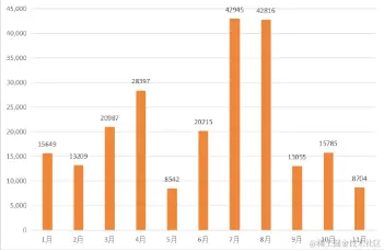 2020 年度,绿盟科技伏影实验室监控到来自 DDoS僵尸网络的指令数逾 104 万条(截止 10 月底), 较 2019 年增幅近一倍。其中 DDoS 攻击指令条目约 103 万。 根据家族信息(含变种)、攻击目标和攻击时间三个维度,并规定指令下发超时时限,得出了逾 16 万起攻击事件,并在 8 月达到峰值。月度攻击事件数变化如下图: