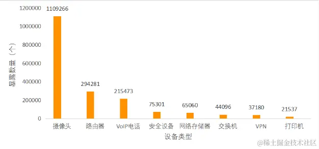 资产暴露情况分析考虑到网络地址变化因素 [7],为保证资产的准确性,所以我们对 2020 年 11 月的国内全部网段测绘 一轮作为今年的资产暴露情况展示数据。结合前述新发现的物联网资产指纹,共发现 186 万个物联网 资产,具体的设备类型分布情况如图 2.4。其中,摄像头、路由器、VoIP电话数量分别位列前三,这和 往年的分布是一样的,但是新增了安全设备和网络存储器;网络安全设备主要是指防火墙、WAF等安 全产品;网络存储器(NAS)是一种专用数据存储服务器,将存储设备与服务器彻底分离,集中管理数 据,从而释放带宽,降低成本。近年来,国内的 NAS服务器遭勒索病毒攻击事件频发,暴露互联网上 的存储设备,更应该保障其安全性。