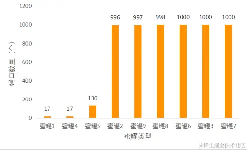 为了描述方便,下面直接用“蜜罐 + 数字”表示我们发现的蜜罐类别。使用 Nmap 探测常用的 1000 个端口开放情况,蜜罐的结果如图 2.6 ,可以看出蜜罐开放的端口数量远多于传统服务应用,甚 至有的开放了全部端口(虽然我们只是抽样对开放 1000 个端口的蜜罐进行端口扫描,但这些蜜罐实际 上几乎全都开放了 65535 个端口)。原因是部署者希望在资源有限的情况下尽可能多地捕获攻击行为, 所以尽可能开放多个端口。此外,考虑到蜜罐开发者会在互联网上部署多个蜜罐,所以可以根绝端口的 开放数量和组合情况对蜜罐进行分类。比如蜜罐 1、蜜罐 4 和蜜罐 5,开放的端口数量和端口组合都是 相同的。