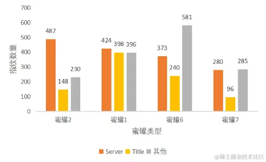 对物联网蜜罐的 HTML页面含有的物联网指纹类型进行统计,具体分布情况如图 2.9 。访问正常的 设备,Server 字段在 HTTP协议的头部,不会出现在页面中。此外,HTML页面同样不会有多个 Title类型, 所以通过这两个字段在 Banner 中出现的次数,可以用来识别某个 IP 是否为蜜罐。