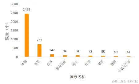 对发现物联网蜜罐的地理分布情况进行统计,如图 2.10 。从统计数据来看,物联网蜜罐部署在中 国的数量最多,其次是美国和日本。猜测可能有两个原因,一方面因为国内这两年物联网蜜罐与威胁的 研究关注度比较高,另一方面因为国内的物联网攻击事件频繁,所以物联网安全研究人员有部署倾向, 这样蜜罐可以捕获更多有价值信息。