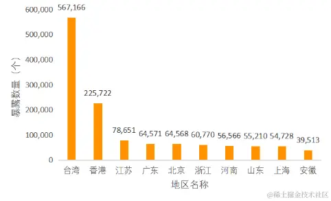 物联网资产的地域分布情况如图 2.5 所示,数量最多的是台湾和香港,这主要是因为这两个地区的 IP 地址数量分配较多,很多物联网设备直接使用互联网