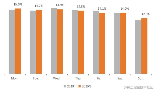 从每周中 DDoS 攻击活动的分布来看,一周中各天所发生的 DDoS 攻击事件比例并无明显差别。背 后的一个重要原因是现有网络服务往往供 7 X 24 服务,因而一周中每一天都可能被攻击。周日依然 是相对平静的一天。