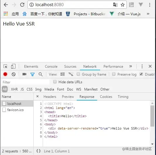 console.log(html) // <div data-server-rendered="true">Hello Vue SSR</div>
