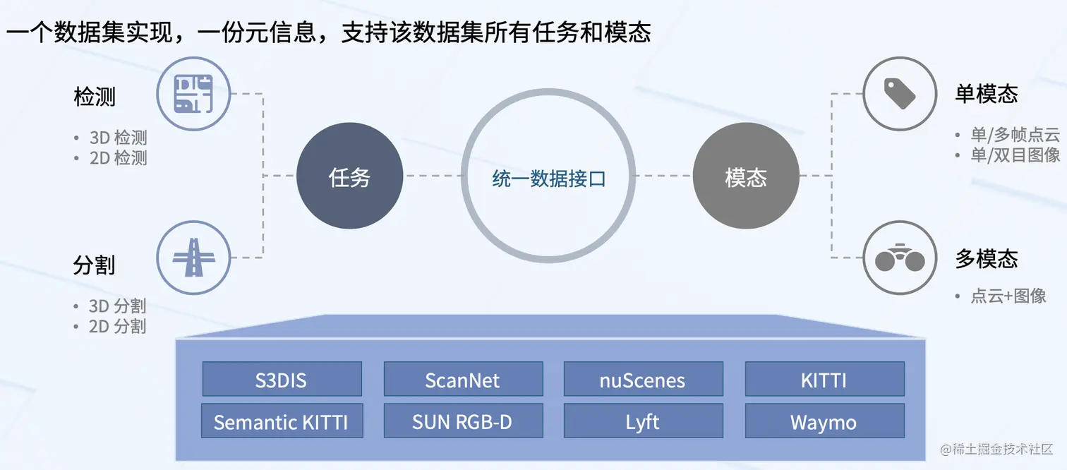 在数据集方面,由于 3D 任务的复杂性,除了上述协同重构的方面外,我们还统一了不同数据集的数据协议:包括在不同模态、不同场景等设置下,数据存储方式(info)、数据读取和数据增强转换等内容。这样使得多模态的统一、跨数据集以及自定义数据集的训练和评测更加方便。