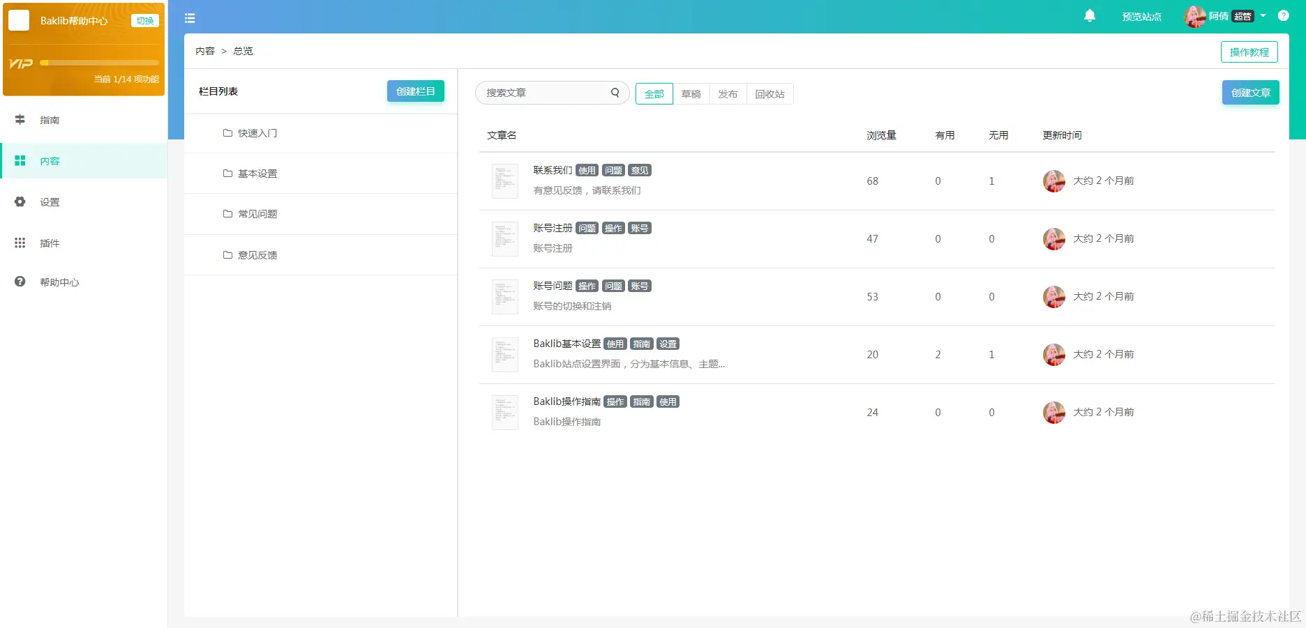 点击开始创建后就进入了后台界面,将问题一一罗列,创建栏目进行分类,填写内容。