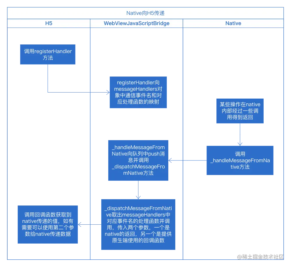 Native向h5传递有点类似h5的事件监听,h5注册一个名称用于标记操作,映射一个回调函数,原生端在用户做了某些操作后,获取到h5注册的操作对应的回调函数,并进行调用,将操作结果传递给h5。