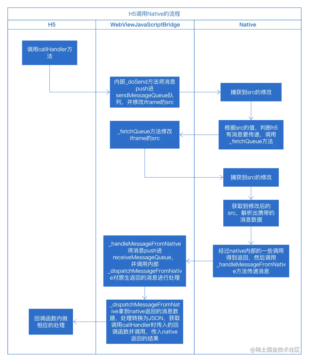 H5调用Native的流程主要利用了iframe与原生端进行交互,通过修改iframe的src来触发原生端调用对应的操作,原生端监听到触发后,经过一系列操作后得到一个结果,再通过调用h5的回调函数,使h5可以处理原生返回的结果。