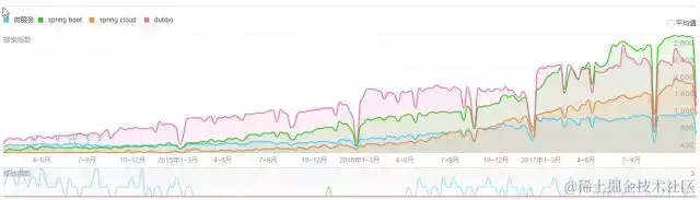 首先给大家看一张百度指数上,关于微服务、Spring Boot、Spring Cloud、Dubbo的趋势图: