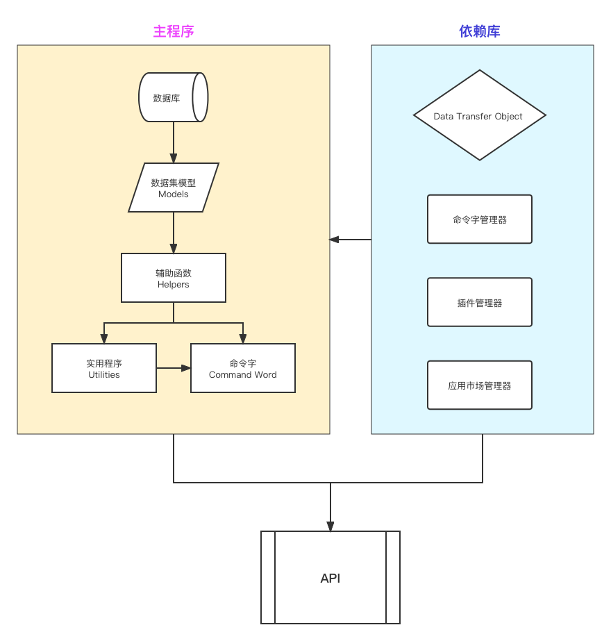 重新梳理后的主程序,插件开发者可以更方便地开发插件。对于主要数据集已经封装好了 Models,对于常用的辅助功能封装成了 Helpers,常用的业务功能封装成了 Utilities,而对于跨业务跨语言的业务功能封装成了 Command Word 命令字(未来的 RPC 的基础)。这些封装都有详细的文档在官网供查阅,插件开发者可以直接调用,减少开发量。