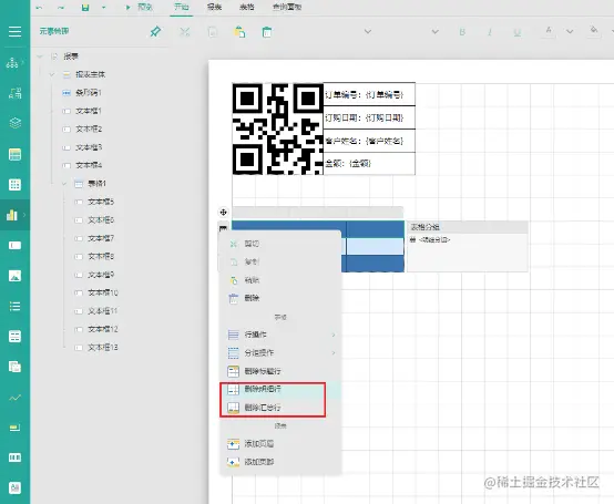 也可以采用表格组件标题行嵌套文本框和数据字段; 选择表格组件,删除汇总行和明细行