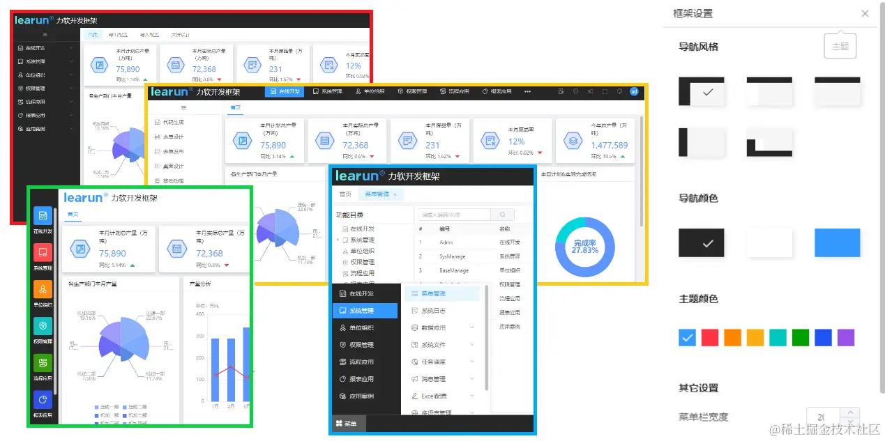 好的UI框架能大大的缩短开发时间,减少代码量,使开发者更专注于业务和服务端,轻松实现界面开发,带来绝佳的用户体验。LeaRun快速开发框架具有独立研发的UI界面,前端采用当前主流的VUE框架,并提供多种主题布局设置以及大量通用性可视化图表组件,用户可以灵活的自定义修改字体、图例等设计。全源码交付的模式让用户可以自由改动,做到定制化开发,让框架的设计聚焦在自己业务的侧重点上,满足企业的多样化设计风格。