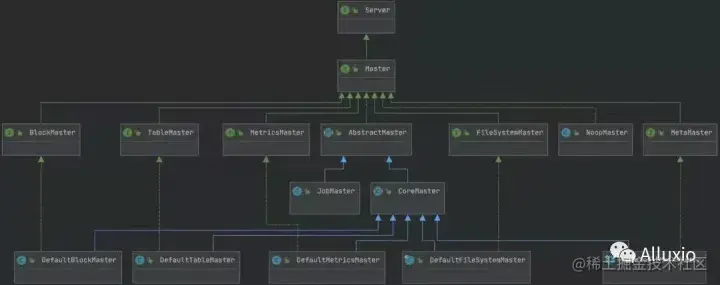 定义Master组件中封装的各个线程Server服务,包括Block元数据管理,文件系统管理等,其细化类图如下所示: