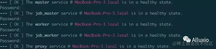 启动后服务成功,也可通过JPS查看Java进程:AlluxioMaster、AlluxioWorker、AlluxioJobMaster、AlluxioJobWorker、AlluxioProxy。