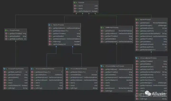 Alluxio服务内部的5个核心进程:AlluxioMaster、AlluxioWorker、AlluxioProxy、AlluxioJobMaster、AlluxioJobWorker 都是基于Process(进程)接口类扩展实现的,定义组件进程的生命周期管理操作。