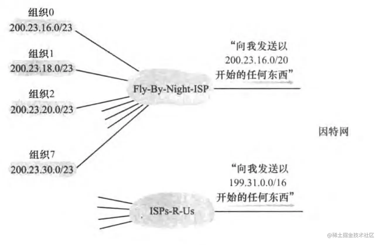 将网络前缀都相同的连续 IP 地址组成 CIDR 地址块。一个 CIDR 地址块可以表示很多地址,这种地址的聚合称为路由聚合(route aggregation)或地址聚合(address aggregation),或称构成超网。