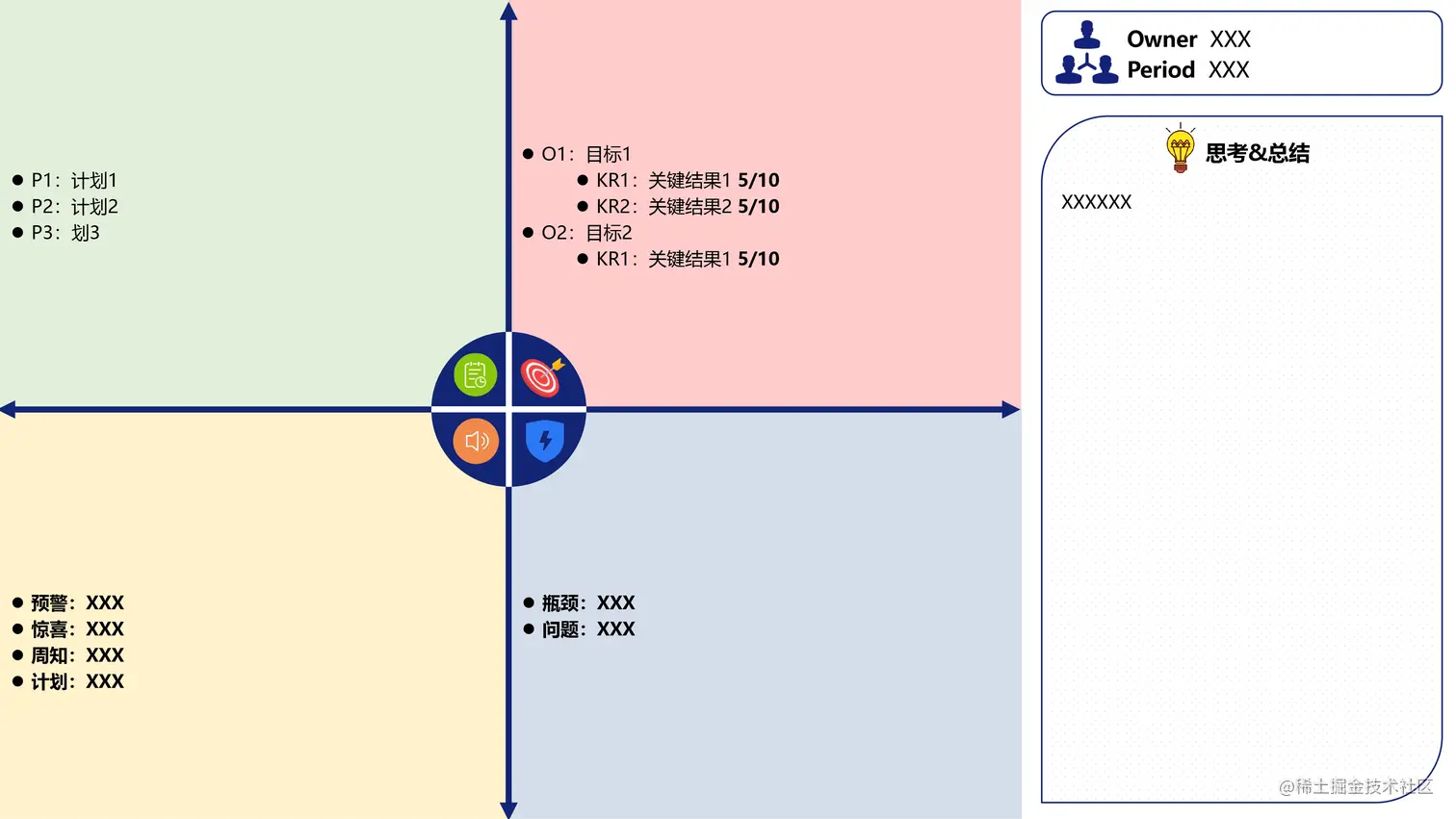 在跟踪阶段,除了“公开透明”、”多人协同”的原则是一定要保留的,你可以继续选择制定阶段的工具,持续地完成过程跟踪。当然也可以结合我们想达成的一些目标,针对性地做一些调整。在初期,我们期望培养责任人的owner意识,希望他们主动地刷新OKR进度;同时为了配合OKR氛围的建设,我们希望责任人能做一些思考&总结性质的工作,并将成果在团队内做一定的呈现,从而带动更多的人。为此我们制定了四象限图的跟踪模板,引导大家做内容成果上的挖掘。图2-2是我们跟踪阶段的OKR工具。