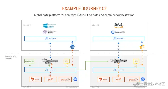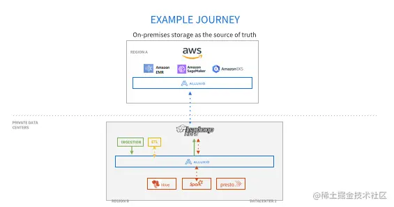 大家可以看到,同样是两个公有云提供商,左边是Microsoft Azure,右边是AWS,可以看到下面ETL job和Ingestion都会直接写到Alluxio里面,在这种场景下,你可以选择写入Alluxio的方式,把这个数据写回到底层的 HDFS上面去, 然后Alluxio会把这个数据分享给不同的数据中心,包括右边的HDFS集群和上面的几个公有云的Alluxio集群。在这种搭建下,只需要一个Alluxio集群,就可以实现数据共享,不需要搭建 ETL数据通道,再去把所有的数据写回到不同的HDFS 集群和另外的Alluxio或者是云计算的对象存储里面。