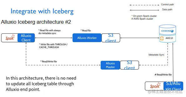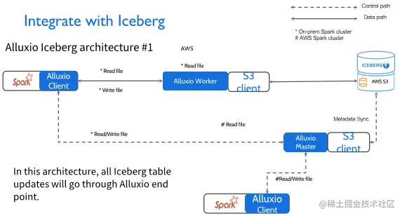 第一种架构比较简单,我们拿 Spark和AWS举个例子,左边 Spark是在私有云的场景,右边Spark是在公有云的场景,在这两个场景里都同时会写入Alluxio集群。所以在这种场景下,读写这两条线都没有太大的问题。因为这一端的强一致性是在Alluxio这层保护的,所以数据对Iceberg的事务性支持就可以得到非常好的控制。
