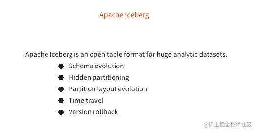 Iceberg是一种开放式的table format,它主要是作为对标 Hive的一种文件,是一种表格存储的格式,主要的应对场景是比较大型的数据分析场景。它提供几种不同的功能,主要有 Schema evolution,hidden partitioning,partition layout evolution 和time travel,还提供version rollback的功能,很多功能是专门为了满足美国关于数据隐私法案的需求,提供事务性的支持。相对于Hive很难实现事务性的支持,Apache Iceberg提供了更好的支持。