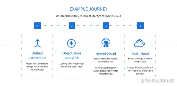 在国内比较常见的场景是从私有云的HDFS到混合云的对象存储,其中我们提供几个功能,第一个叫unified name space,你可以把 HDFS集群和对象存储的集群都mount到一个统一的Alluxio cluster里面进行管理,提供完整的基于对象存储的一套分析解决方案。在这种场景下,比较常见到的是混合云部署,就是说既有公有云也有私有云。