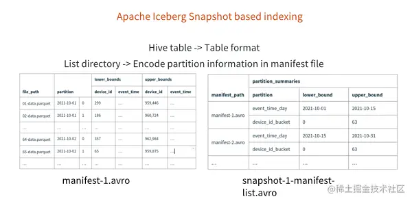 然后我们可以看一下,比如说在右边manifest list里面,它会标注 manifest file在哪里,比如说manifest-1.avro这个file,它有一个partition的概念,event time是2021年10月11号到2021年10月15号,有一个最小的event date和最大的event date,然后对应到左边就可以找到 manifest file,这个 manifest file会对应所有的 Parquet文件,因为我们知道Parquet文件是通过最小值和最大值去做 predicate pushdown,等于说在这个概念里面,它就把所有的最小值和最大值都include到Iceberg的metadata里面去了,就不需要去list directory,去fetch parquet header获取做 predicate pushdown的元数据,而是可以一次性把所有的数据都拉过来,进行indexing的操作。大家如果对Iceberg的indexing比较感兴趣的话,我推荐大家去看下面的 tabular log,这是Ryan最新写的关于Iceberg如何做indexing的非常详细的blog,大家如果感兴趣可以看一下。