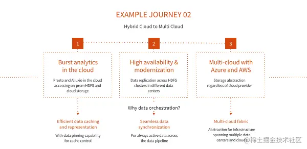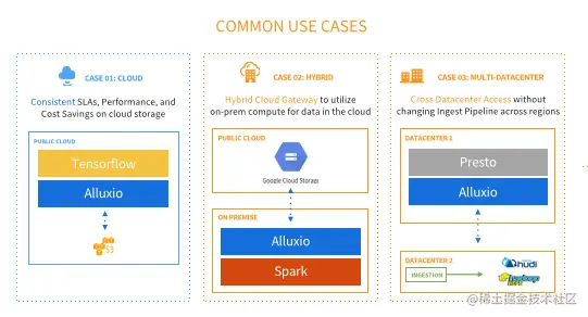 第三个是多云部署。拿美国这边打个比方,比如说你需要用AWS的 S3, 同时要用GCP的BigQuery引擎,你可以进行混合云的部署,也就是说你可以在 GCP里面部署Alluxio集群去query S3的数据,这样就可以更好地搭建混合云。