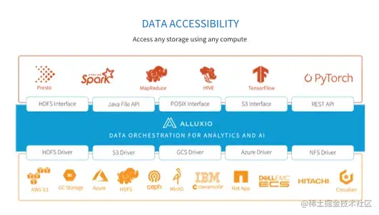 Alluxio第一个功能是可以使用Alluxio去连接所有的计算引擎和存储系统,如果你上面的系统搭载了 Presto、Spark、 MapReduce、Hive这一类的系统,你可以通过Alluxio去访问下面所有的存储引擎,包括但不仅限于我在这里列的HDFS,S3、GCS、Azure和NFS等,我们有更全面的支持,包括上层的计算引擎和下层的存储系统。