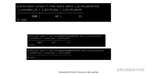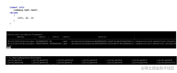 这个其实大家都会——写个SQL,从这个select*from Test1的时候,指定一个条件,我这个月份是13,那就把我刚才新插入的那一条记录给调出来了。我后面会介绍一下怎么做时间穿梭(Time travel),我们可以看到在这个表名test1这有个@符,后面我可以加一个 snapshot ID,如果我用第二个(快照)snapshot,就能查到这个记录,如果我用第一个snapshot就没有这个记录,为什么?因为第一个query发生在插入这条记录之前。这还挺有用的,因为有的时候就想查一下我这个表昨天是什么样的。但这也有问题,如果你频繁插入数据的话,就会产生大量的snapshot,avro里面就会有大量的数据。那我们是不是要丢掉一些过期的快照?这也是个优化点,现在presto还没有,但以后我觉得我们会把它做进去。