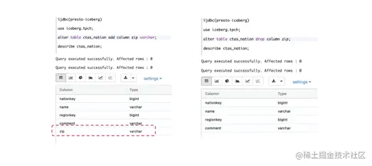 这个是我的前同事Chunxu做 Schema Evolution的时候截的一张图。可以看到这也是Iceberg的一个亮点,就是说这个表原来有几列,我可以加一列或者改一列,当然这也不难,因为原来 Hive table也可以这样做,但是做完之后,你的table还能不能查?Iceberg给我们的答案是 table改完了还能查,当然这里边也有tricky的地方,里面的数据也不是这么完整,但是不管怎么样它没出错,你先改好table,用老的query还能够查到。这个功能我觉得还是挺实用的,因为各个公司 table总在改,改完之后 table在presto这边还是可以查的。