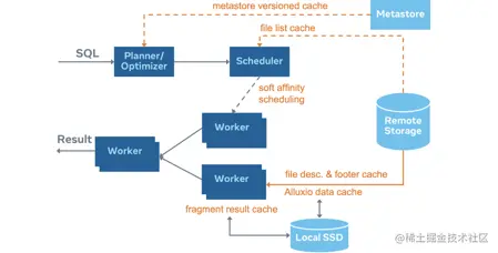 这个里边有关键点得跟大家说一下,这个 local cache像是每个worker自己的私有缓存,它不像Alluxio cache那样,是一个分布式的、弹性的,可以部署比如说100个节点或200个节点,可以水平扩展的。但是这里不一样,这里边给你一个就近的小容量的local缓存,给每个worker可能500g或者1TB的一个本地磁盘,用来当作缓存使用。
