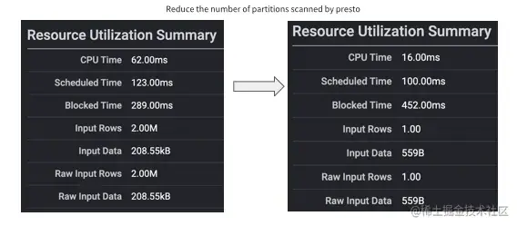 我们来看看效果,这不是一个正规的Benchmark,就是刚才我建的 table,新加了一条记录,月份等于13的那个,如果我不开下推的话,是左边这种情况,它扫了200万条记录,input数据是200多KB;开了下推之后,它只扫描一条记录,时间和数据都有非常大的提升,它只扫特定的分区。这种查询在现实中遇不到,因为现实中肯定是有更多的组合,每个partition下面可能还有更多的文件,这里比较极端一些,只有这一个文件。其实这样效果不明显,文件越多效果越好,推荐大家试一试。