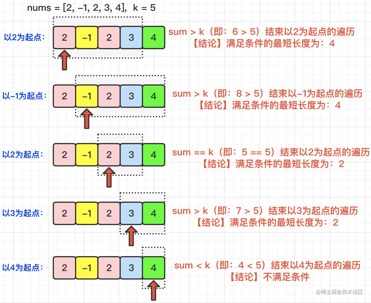 根据题目描述,我们要找到N个子序列,并且要求子序列的总和要大于等于k,并且只要最短长度。那么,对于一个数组有多少子序列,我们首先需要确定数组子序列的起点。那么,由于题目中只需要最短长度,所以,假设我们以i为起点向后拼装子序列,只要子序列总和大于等于k,则立刻结束以i为起点的子序列组合行为。具体如下图所示: