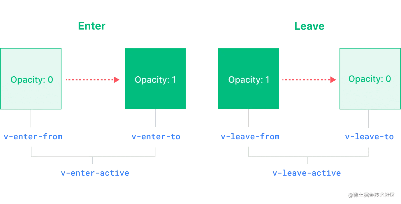 - v-leave-to:离开过渡的结束状态。在离开过渡被触发之后下一帧生效 (与此同时 v-leave-from 被删除),在过渡/ 动画完成之后移除。