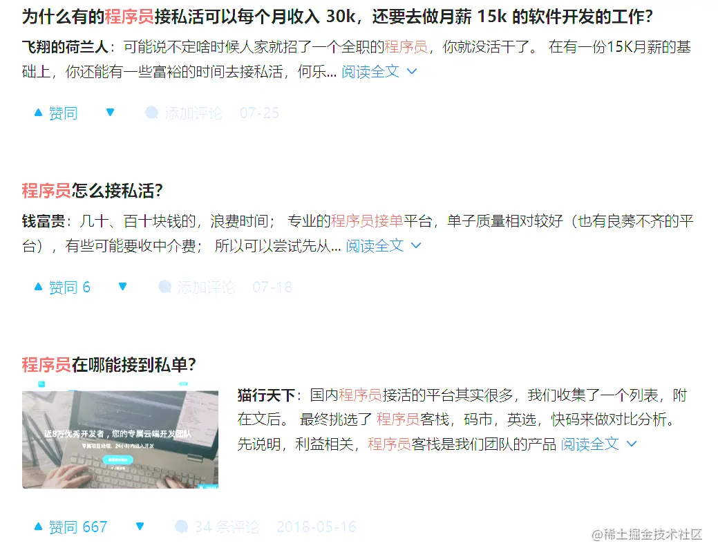 但这些问题前人都是有解决方案的,倘若是你真的有接单的想法,去掘金、知乎这些社区里看一看,学习学习,大多数问题都是可以解决的: