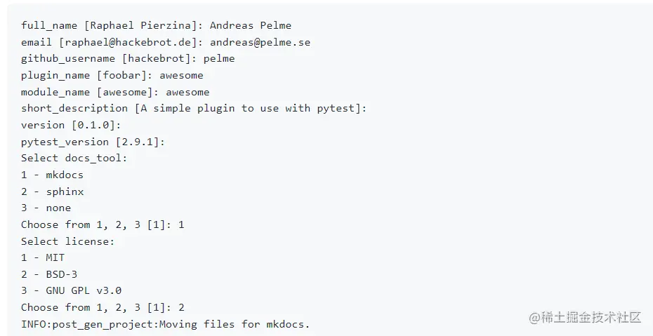 但是在开发之前,先来了解下cookiecutter-pytest-plugin这个项目。这是官方文档中强烈推荐的,可以帮助我们快速生成一个规范标准的插件项目。