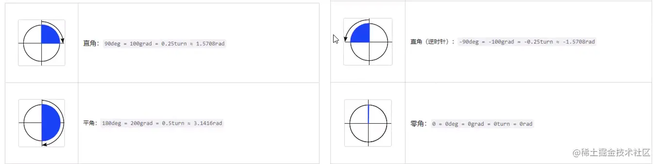 度(degrees)、百分度(gradians)、弧度(radians)或圈数(turns) ;