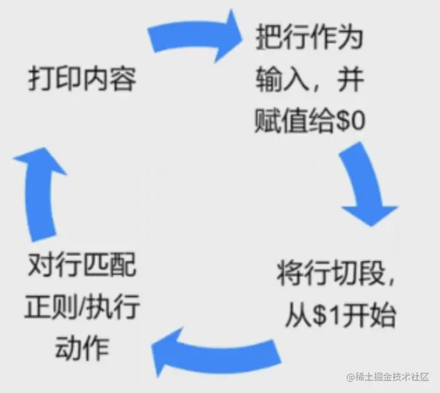 以换行符为默认记录分隔符,逐一读取记录,以空格为默认域分隔符将每条记录切片,切开的部分再进行后续处理